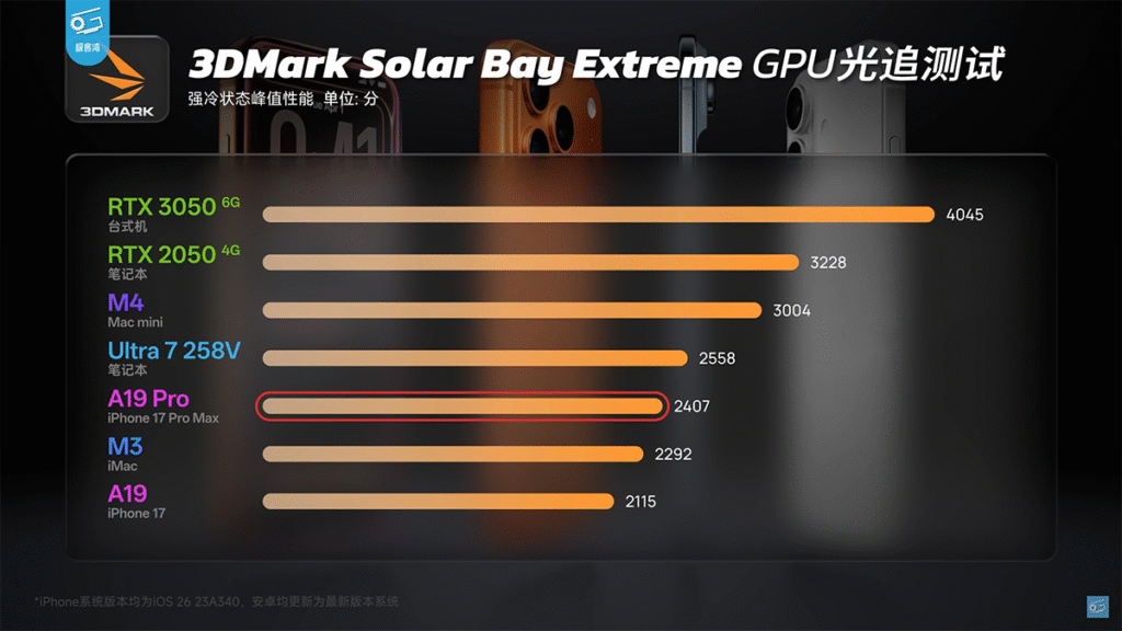 Sự đột phá thực sự nằm ở khả năng dò tia (Ray Tracing). Trong bài kiểm tra 3DMark Solar Bay Extreme mới, dòng A19 cho hiệu năng Ray Tracing cao hơn 50% so với thế hệ trước. Sức mạnh này không chỉ bỏ xa các đối thủ di động mà còn đáng kinh ngạc khi so sánh với các GPU cho PC. Hiệu năng Ray Tracing của A19 Pro thậm chí còn vượt qua cả chip Apple M3 và tiệm cận với các GPU laptop như M4 và RTX 2050.