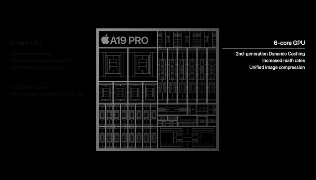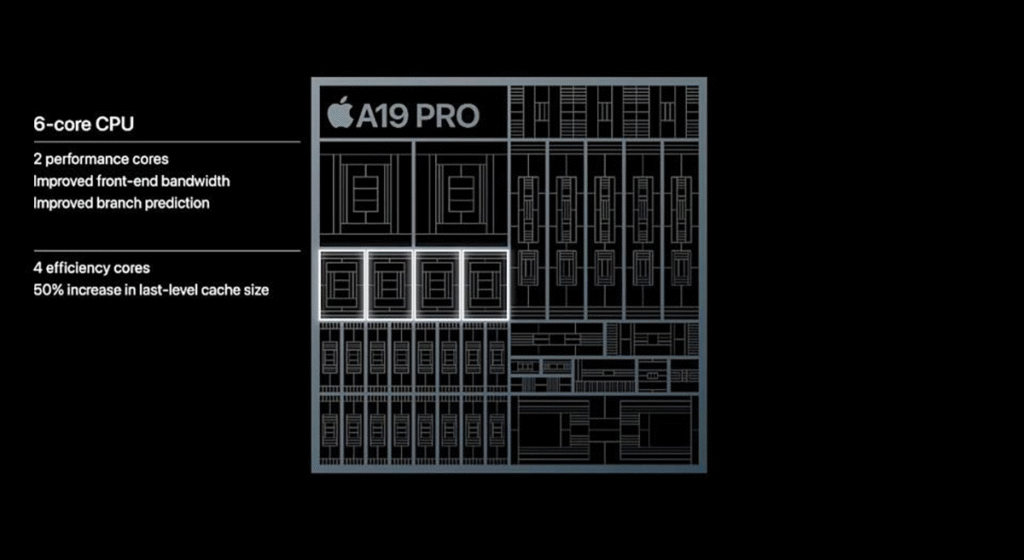 Cả hai chip A19 và A19 Pro đều là những dòng chip hiện đại bậc nhất thời điểm hiện tại. Mặc dù số lượng lõi CPU vẫn là 6 (2 lõi hiệu năng cao P-core và 4 lõi tiết kiệm điện E-core), kiến trúc bên trong đã được tinh chỉnh đáng kể để nâng cao hiệu suất.